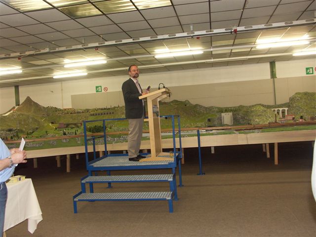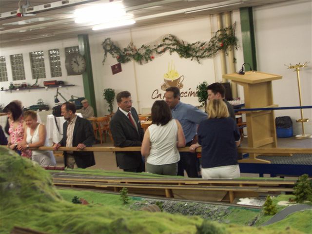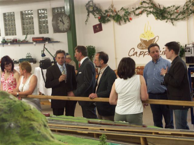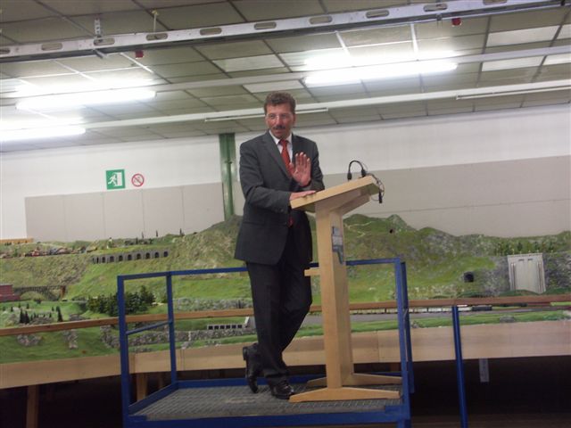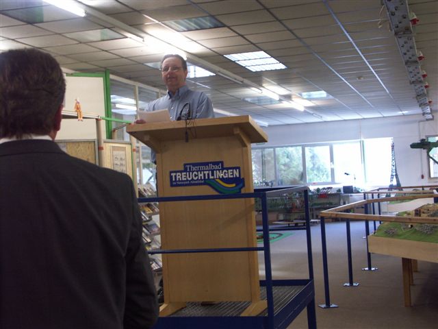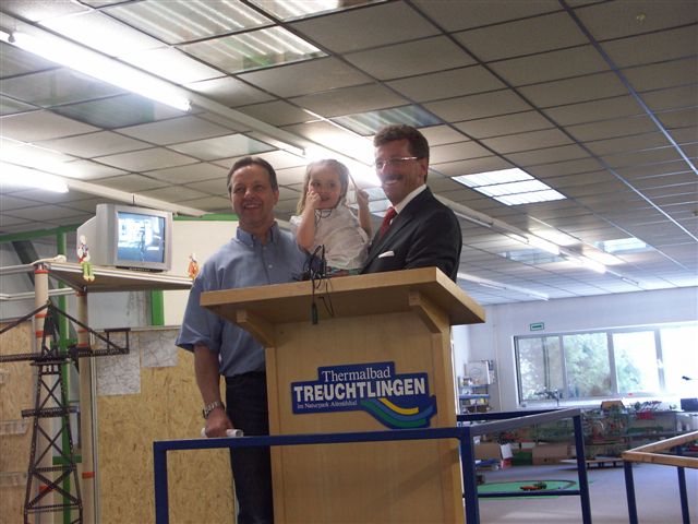 Am 10.Mai 2008 war es endlich soweit, das Miniaturland-Treuchtlingen wurde offiziell Eröffnet. Pünktlich um 10°°Uhr traf der Schirmherr, Fraktionsvorsitzende der CSU, Georg Schmid, im Miniaturland Treuchtlingen ein. Nachdem am Freitag über Radio 8 und Bayern 1, tolle Berichte über das Miniaturland-Treuchtlingen gesendet wurden, stand der Eröffnung nichts mehr im Wege. Nach einer Begrüßung und kurzer Information über die Modelleisenbahn, übernahm Bürgermeister Baum auch im Namen des anwesenden Altbürgermeister´s Hermann das Wort. Nach vielen lobenden Worten, weil er ja selbst Eisenbahner war und Treuchtlingen ja eine Eisenbahnerstadt ist und somit das Miniaturland hervorragend in das Konzept von Treuchtlingen passt, kam nun zum Schluß der Schirmherr und ehemalige Schulkamerad, Fraktionsvorsitzende Georg Schmid ans Rednerpult. Frei und ungezwungen wurden Jugenderinnerungen, Kindheitsträume fast aller Männer (Eisenbahn),Tourismusinteresse der umliegenden Nachbarlandkreise als Vermarktung im Verbund und Zusammenarbeit, nicht als Konkurenz zu sehen sei, angesprochen. Am Ende der sehr kurzweiligen und interessanten Ansprache, gab meine Tochter auf den Armen von Georg Schmid, den Startpfiff zur Abfahrt der ersten Lokomotive und setzte somit eine Kettenreaktion der ganzen Anlage aus, bis alles in Bewegung war. Somit war nach einem 4-monatigem Umzug von Pappenheim nach Treuchtlingen, das Miniaturland Treuchtlingen nun offiziel Eröffnet und hofft nun eine tolle Bereicherung der Region zu sein. Für die bisherige Zusammenarbeit der Tourismusinfo Treuchtlingen, Tourismusbüro Langlau/Pfofeld, Fremdenverkehr Pappenheim, Fremdenverkehr Dollnstein, Altmühltalinformationszentrum Gunzenhausen und San-Aktivtours Gunzenhausen, möchte ich mich recht herzlich bedanken und hoffe auch weiterhin auf fruchtbare Zusammenarbeit. Nach einem kleinen Umdrunk, einer Brotzeit und kleinen Aufräumungsarbeiten der Eröffnungsfeier, wurde die Anlage um 13°°Uhr für die Öffentlichkeit freigegeben und freuen uns auf Ihren Besuch, bei der Modelleisenbahn für die ganze Familie. |