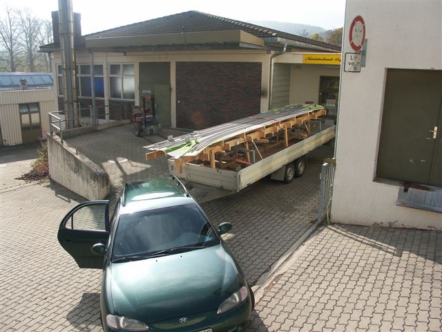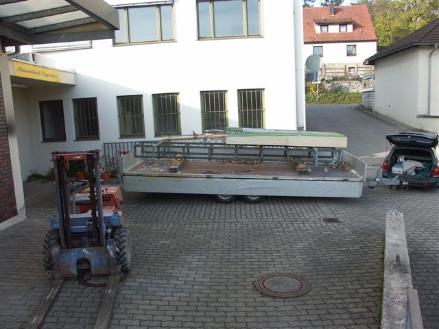 Transport der Anlage Die Teile sind von der Breite hart an der Grenze des möglichen. Ich habe die Türe um 40cm verbreitert,(Mauerdurchbruch), um die Teile überhaubt aus der Halle zu bekommen. Sie sind auch gewichtsmässig an der Grenze des mit unseren Mitteln zur verfügungstehenden Möglichkeiten des Transportes, denn Schlüsselstelle ist und bleibt der Türdurchgang der alten Halle. Einen breiteren Durchbruch haben wir uns nicht zugetraut, weil sonst die Statig des Türstzurzes in Frage gestellt ist. Nach langen Vorbereitungen sind nun die ersten Teile unterwegs nach Treuchtlingen, das nur wieder möglich war, durch freundschaftliche Beziehungen zu mehreren Firmen, die Transportzmittel unentgeltlich zur Verfügung stellten.