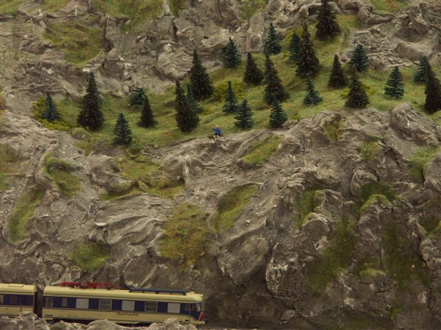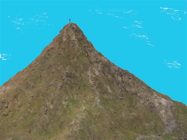 Bergsteiger erklimmen das Gipfelkreuz unter blauem Himmel